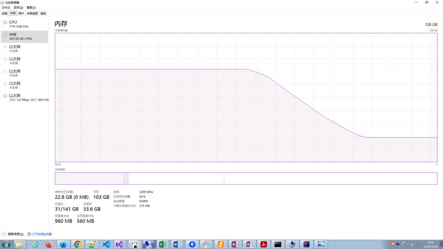 2024/01/10 发现服务器 A 运行程序警告内存不足。调查发现无用户进程占用较高,任务管理器显示存在有 72G 内存是已缓存。