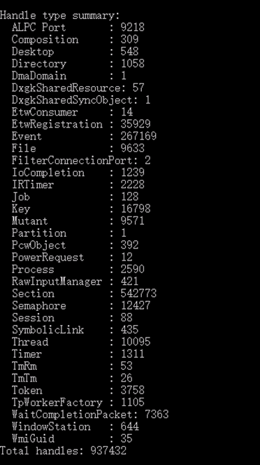使用工具统计系统全部句柄,其中 Section 最多,为 542773 个: