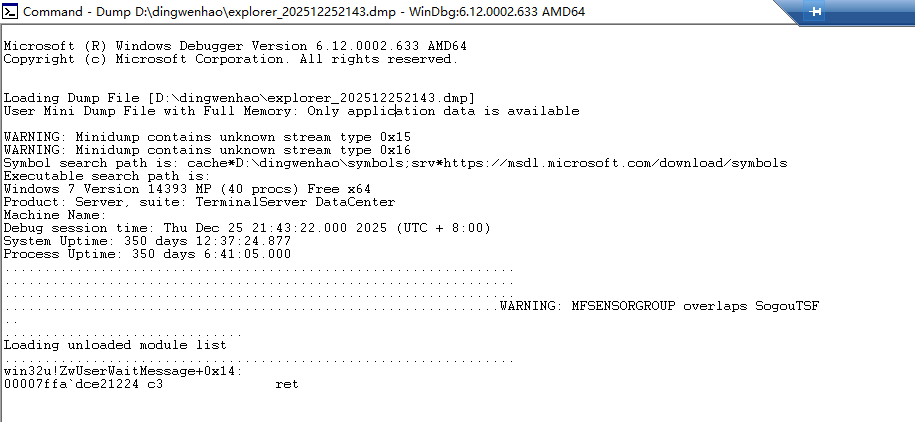 dump一个explorer,打开查看,有个报错:WARNING: MFSENSORGROUP overlaps SogouTSF
